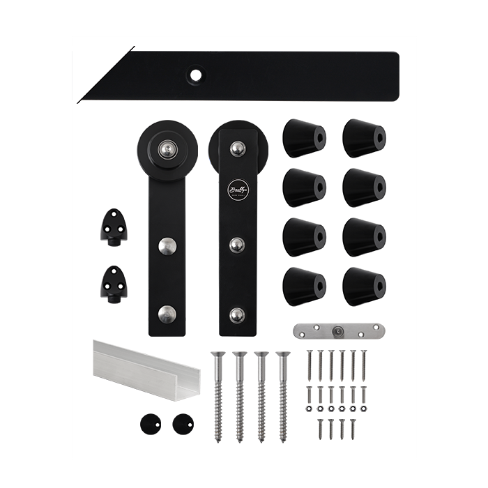 Track, hangers, stops, standoff spacers, bottom guide, door insert, anti-jump cams and fixings.