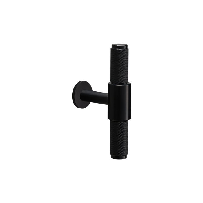A T-bar made from solid metal. This T-bar features the signature, diamond-cut, cross-knurl pattern and is refined by hand. They work great on cabinet doors, wardrobe drawers, cupboards, kitchen units and just about anything that can open.